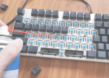 使用壓縮空氣罐對鍵盤底座進行吹塵,特別注意鍵軸周圍和縫隙中的灰塵和碎屑。